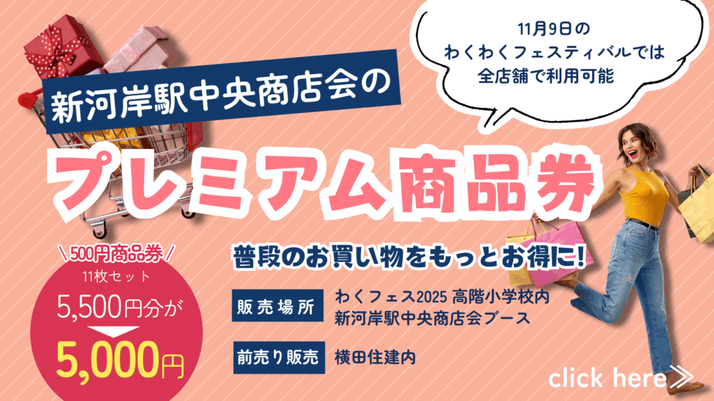 新河岸駅中央商店会では、まちがもっと楽しくなる「おトクなクーポン」をご用意しています。